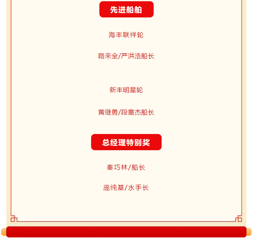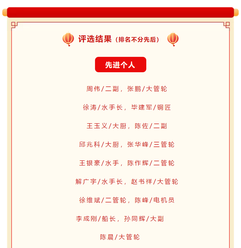 艱辛的一年就要過去了,為表彰先進,樹立典型,弘揚進取精神,充分調動廣大船員的積極性、主動性和創(chuàng)新性,進一步激勵工作在一線船員的工作熱情,形成“船船爭先進、人人比貢獻”的良好氛圍。經(jīng)研究決定,對本年度內公司所有派員船舶及所派船員進行評比考核,結合船東對各輪的考核,評選出新的“先進船舶”、“先進個人”及“總經(jīng)理特別獎”,并給予一定的物質獎勵。